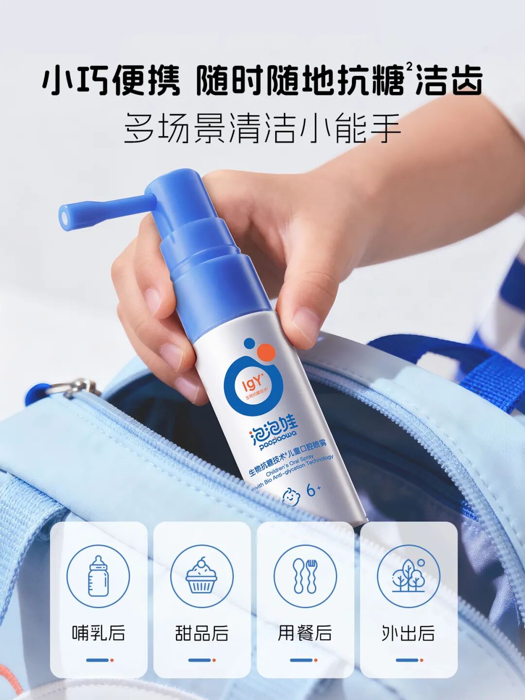 产品小巧便携,无论是哺乳后、甜品后、用餐后还是外出后,都能随时随地为孩子进行抗糖洁齿。