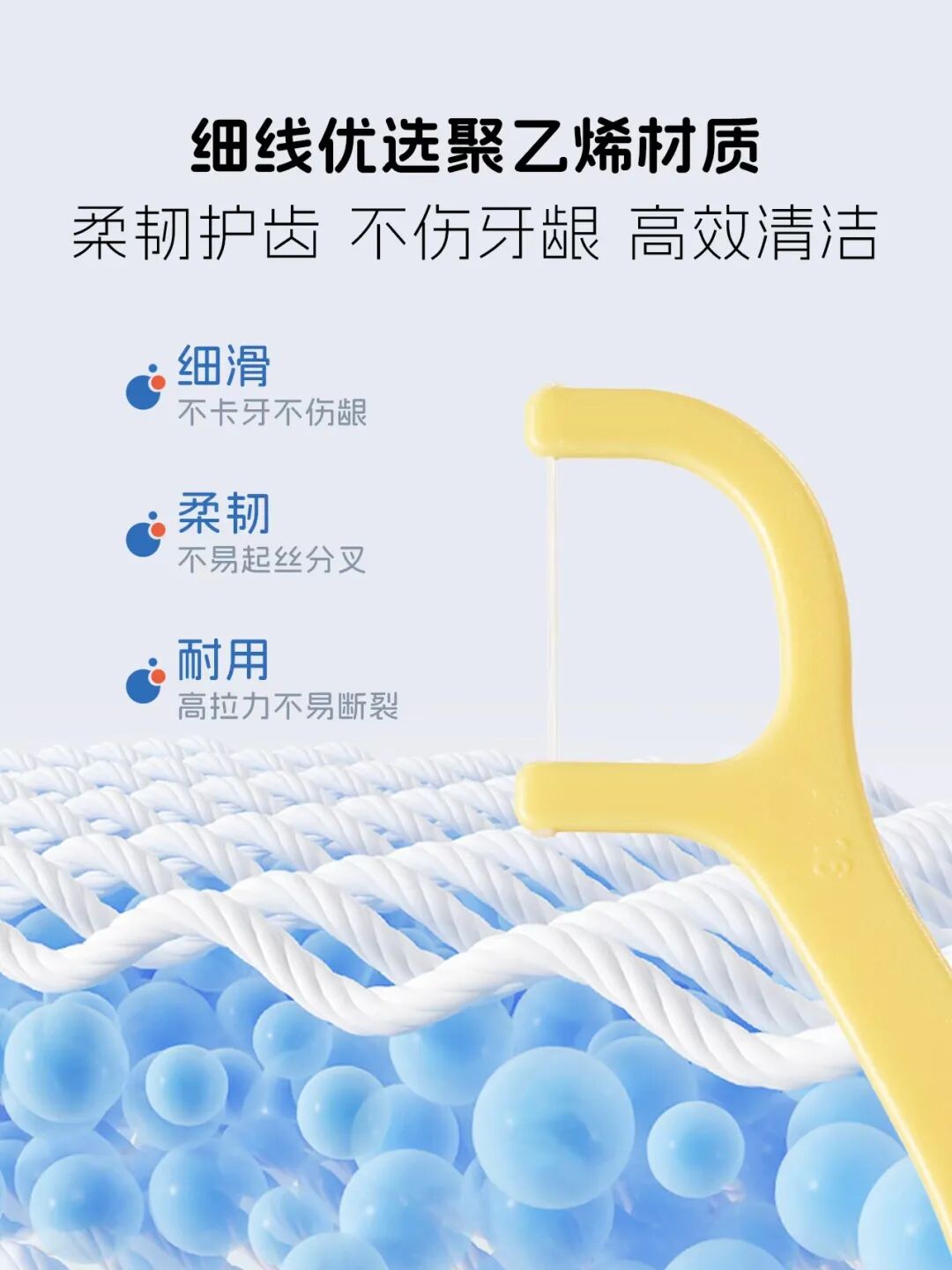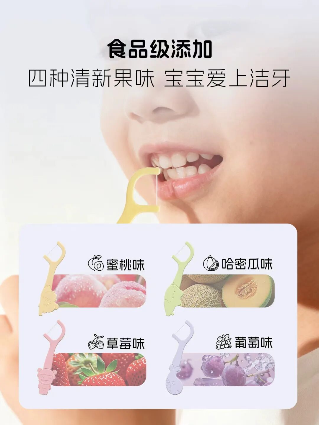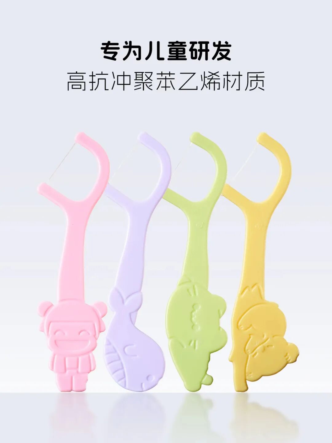 采用优选聚乙烯材质细线,专为童牙定制,细滑不卡牙、不伤龈。