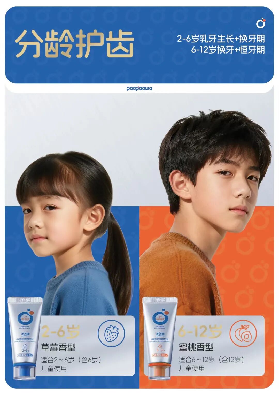 针对2-6岁和6-12岁儿童分别设计,2-6岁为草莓味,6-12岁为蜜桃味,满足不同年龄段口腔护理需求。产品不添加SLS,无刺激,采用温和磨料,不伤牙釉质。